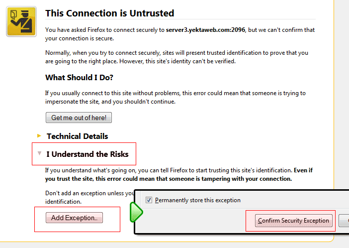 تایید اخطارهای مرورگرها: اگر هنگام مشاهده نشانی های وب میل و سی پانل با اخطار مرورگر مواجه شدید، با کلیک روی مواردی که در تصاویر زیر مشخص هستند، آن را تایید کنید.